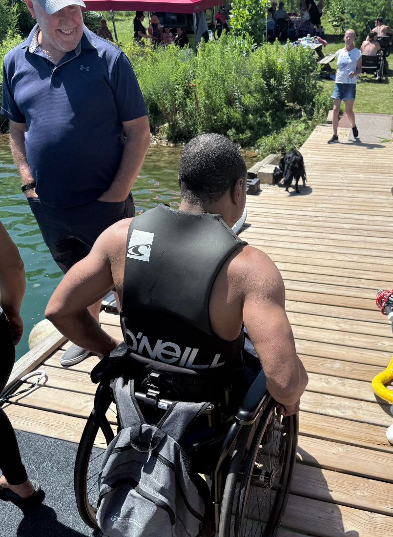 This summer, Spinal Cord Injury Ontario (SCIO) hosted 2 amazing Adapted Water Ski events. One was held in Ottawa in partnership with the SkiAbility Team, and the other was in Guelph in Partnership with Jake Thomas and his volunteers, who train with the National Water Ski Team. These exciting events, generously sponsored, provided unforgettable adaptive waterski experiences for our members with spinal cord injuries. They brought together participants who use wheelchairs and other mobility devices, alongside volunteers, family members, community supporters, and sponsors. From the first splash to the last ride across the waves, the atmosphere was filled with excitement, encouragement, and joy.